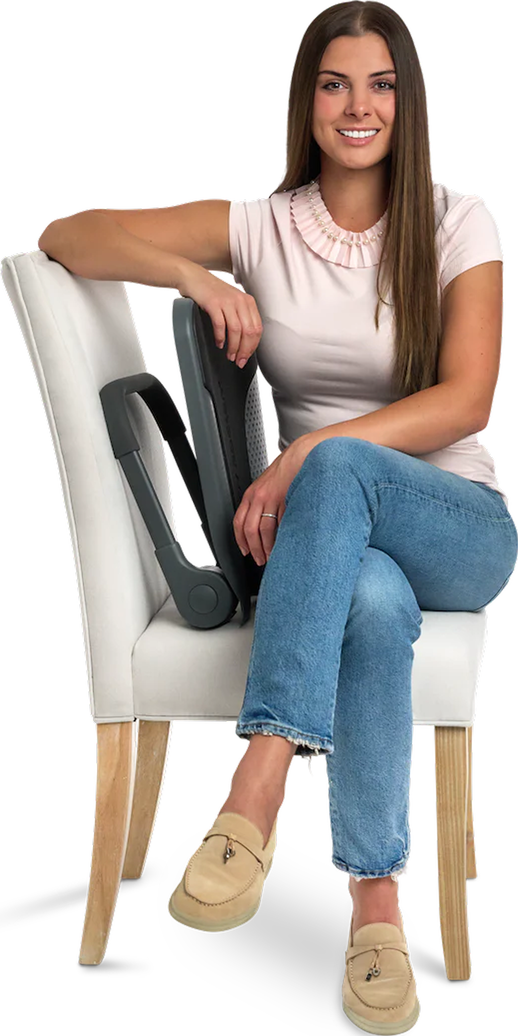 Not at all. It's designed with two adjustable positions – one for shallow seating and one for deeper surfaces. This means it works with couches, beds, office chairs, park benches, and more. For extra space in deeper chairs, simply place the rocker flush against the seatback and use the Smart Strap to hold it securely. You get active sitting support without crowding your space or changing your setup.