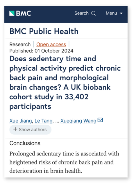 A BMC Public Health study (Oct 2024) tracked 3,006 people for 8 years and found that sitting over 6 hours a day increased chronic back pain and brain deterioration by 33%.